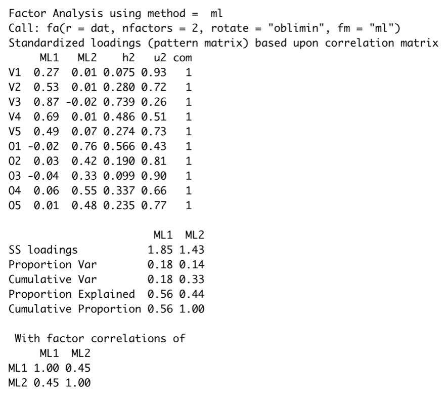 Der folgende Output zeigt das Ergebnis einer Faktorenanalyse mit obliquer Rotation der Items eines Verlässlichkeitsfragebogens (V) sowie der Items eines Ordentlichkeitsfragebogens (O).