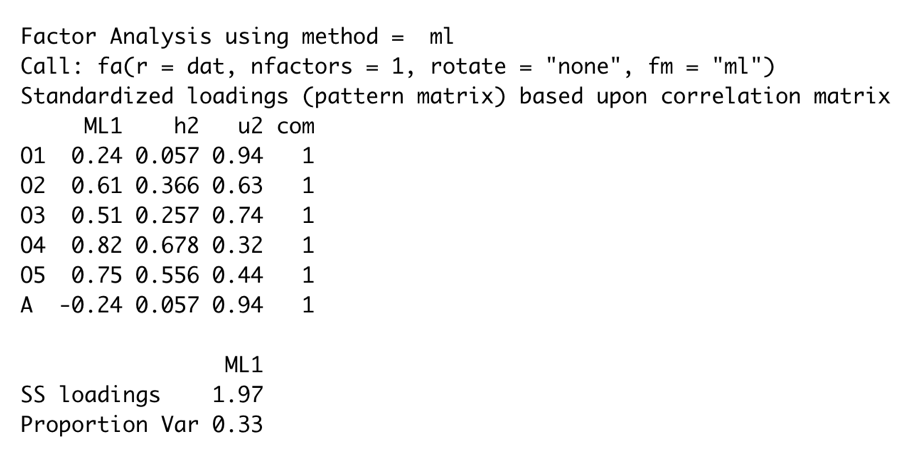 Der folgende Output zeigt das Ergebnis einer Faktorenanalyse der Items eines Offenheitsfragebogens (O) sowie dem messfehlerfreien Kriterium Alter (A). Geben Sie einen Schätzwert für die Korrelation \(COR(\theta_{O}, \theta_{A})\) an.