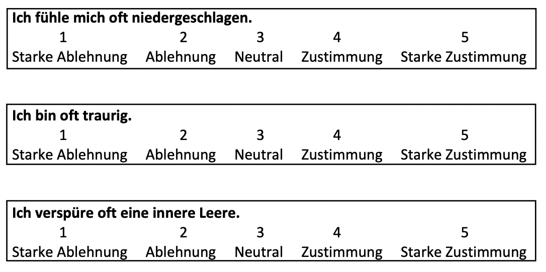 LösungErste Annahme: Die durchschnittlichen Antworten einer Person auf die drei Items bei unendlich Wiederholung des Tests sind exakt gleich und entsprechen der Ausprägung der Person auf der latenten Variable Depression