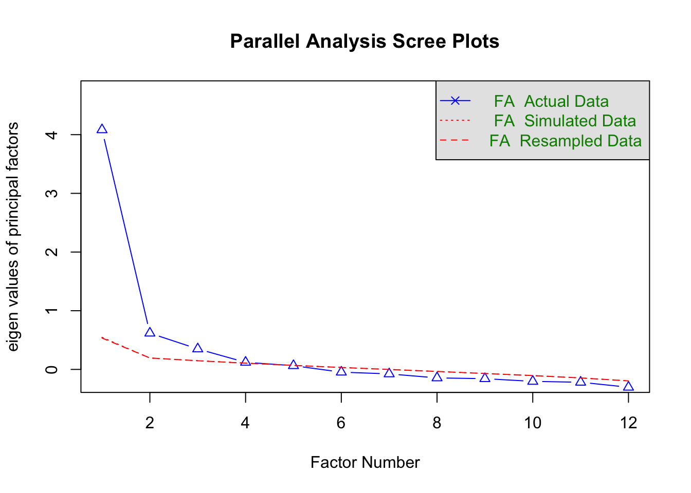 - Blaues Dreieck > Rote Linie: Ein Faktor wird als „real“ interpretiert. Das bedeutet, der Eigenwert des Faktors ist signifikant höher als zufällig simulierte Eigenwerte.