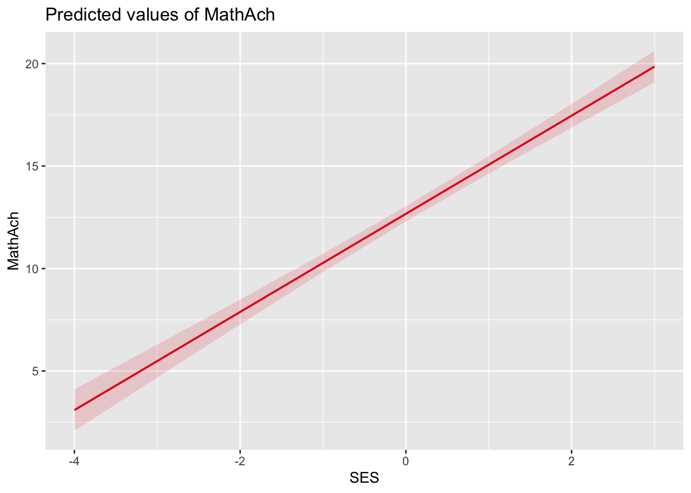 An der Interpretation von iii. und iv. sehen wir, dass es leichter zu interpretieren wäre, wenn \(SES = 0\) eine inhaltliche Bedeutung hätte. Im vorliegenden Fall ist SES im Datensatz bereits grand-mean zentriert, wir können die Interpretation also auf “Personen mit durchschnittlichem SES” anwenden.