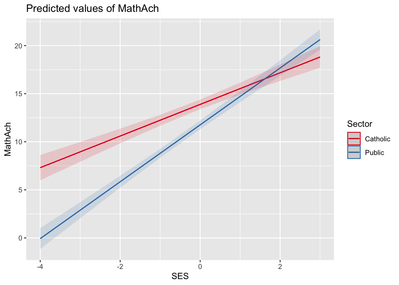 \[ \begin{aligned} \widehat{MathAch_{ij}} &= 13.9 + 1.6SES_{ij} + (-2.1)Sector_j + 1.3SES_{ij}Sector_j \\ \\ \widehat{MathAch_{ij}} &= \begin{cases} 13.9 + 1.6 SES_{ij} & \text{falls } Sector = 0,\\ (13.9 - 2.1) + (1.6 + 1.3) SES_{ij} & \text{falls } Sector = 1. \end{cases} \end{aligned} \]