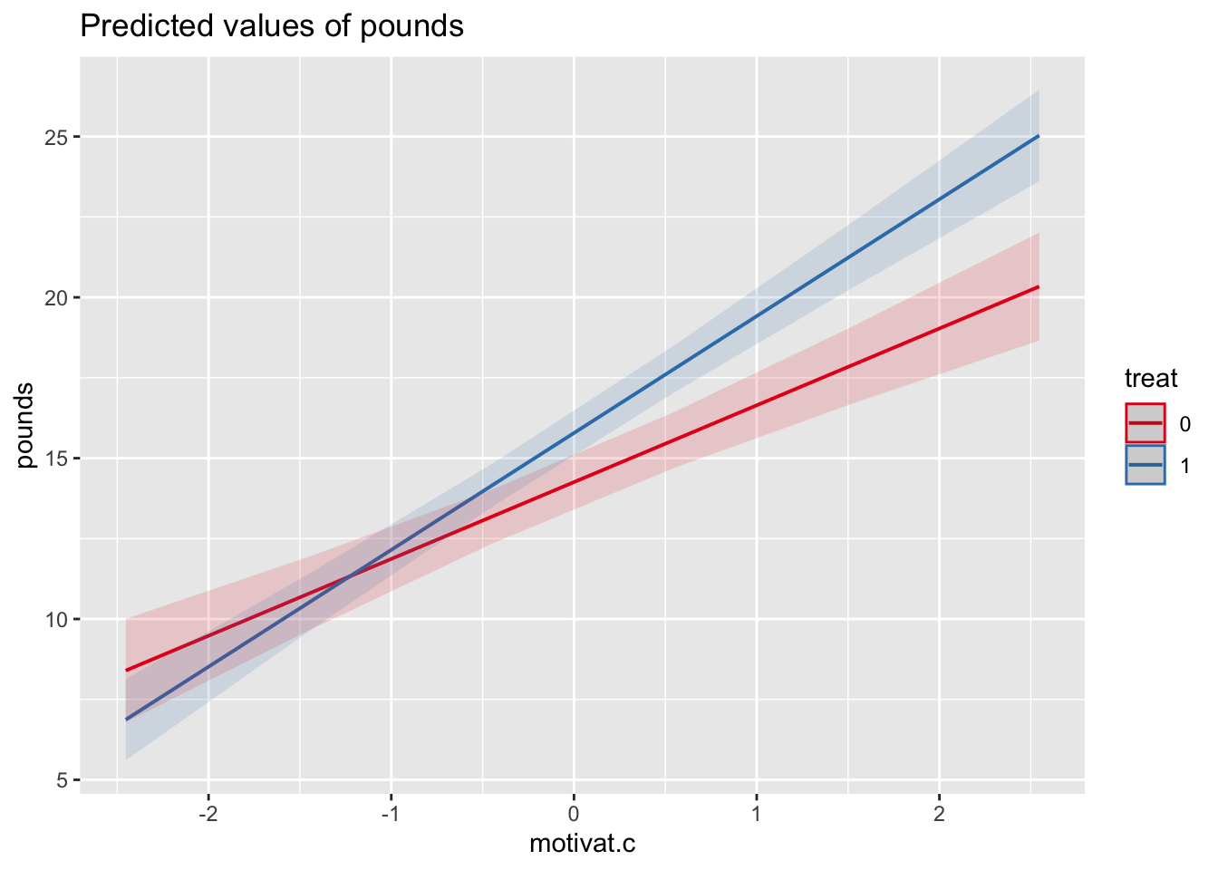 Für Teilnehmer einer Treatmentgruppe ist bei durchschnittlicher Motivation (\(motivat.c = 0\)) die erwartete Gewichtsabnahme im Mittel um \(\gamma_{10} = 1.53\) Pfund stärker als bei einer Kontrollgruppe. Da signifikant (\(t(33.31) = 2.89\), \(p = 0.007\)), verwerfen wir die Nullhypothese und nehmen an, dass bei durchschnittlicher Motivation Teilnehmer einer Treatmentgruppe 1.53 Pfund mehr abnehmen als Teilnehmer einer Kontrollgruppe.