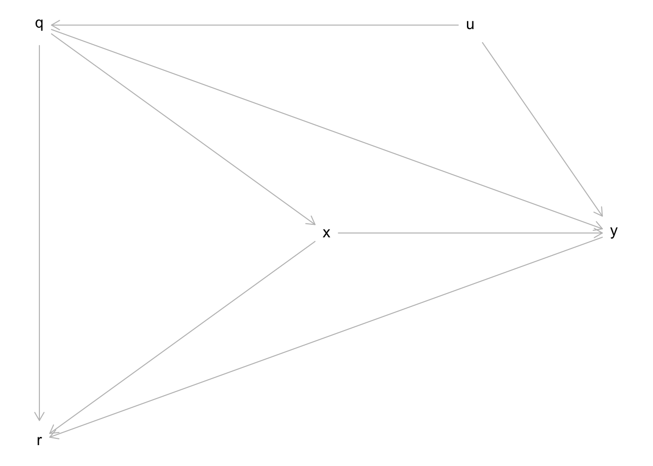dat <- data.frame(x = x, y = y, q = q, r = r)Es liegen drei Backdoor Pfade vor: 1. X <- Q <- U -> Y, 2. X <- Q -> Y, 3. X <- Q -> R <- Y. Die ersten beiden Pfade sind offen und müssen durch die Kontrolle einer Variable auf dem Pfad geschlossen werden. Beide Backdoor Pfade können durch die Kontrolle der Variable Q geschlossen werden. Der dritte Pfad ist geschlossen, denn die Variable R ist ein Collider. Für R darf daher auf keinen Fall kontrolliert werden, um den Pfad nicht versehentlich zu öffnen.