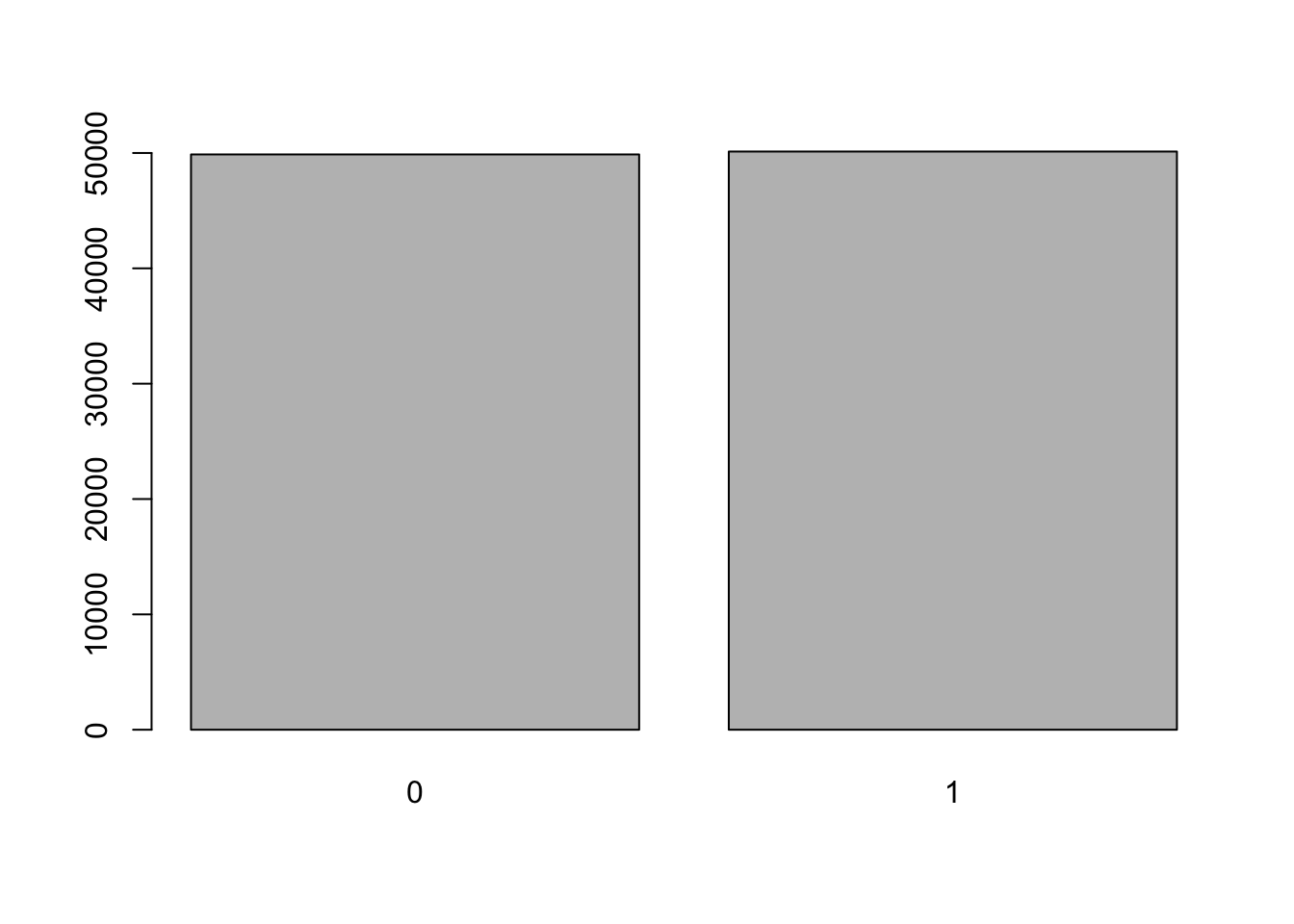 x <- rbinom(n, size = 1, prob = 0.5)Der Vektor x enthält 100000 zufällige, unabhängige Ziehungen aus einer Bernoulliverteilung: \[X_i \sim B( 1, 0.5)\] Das Balkendiagramm der Werte in x zeigt, dass die Werte 0 und 1 bei \(\pi = 0.5\) ungefähr gleich häufig beobachtet werden: