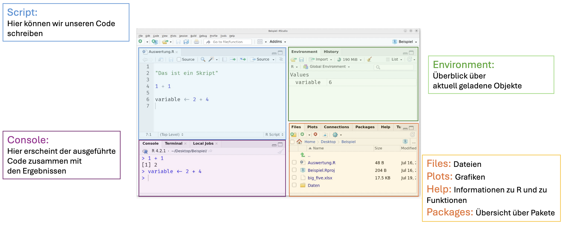R, wie wir es verwenden, besteht aus zwei Programmen: R und RStudio. R und RStudio sind nicht das Gleiche, bauen aber aufeinander auf.
