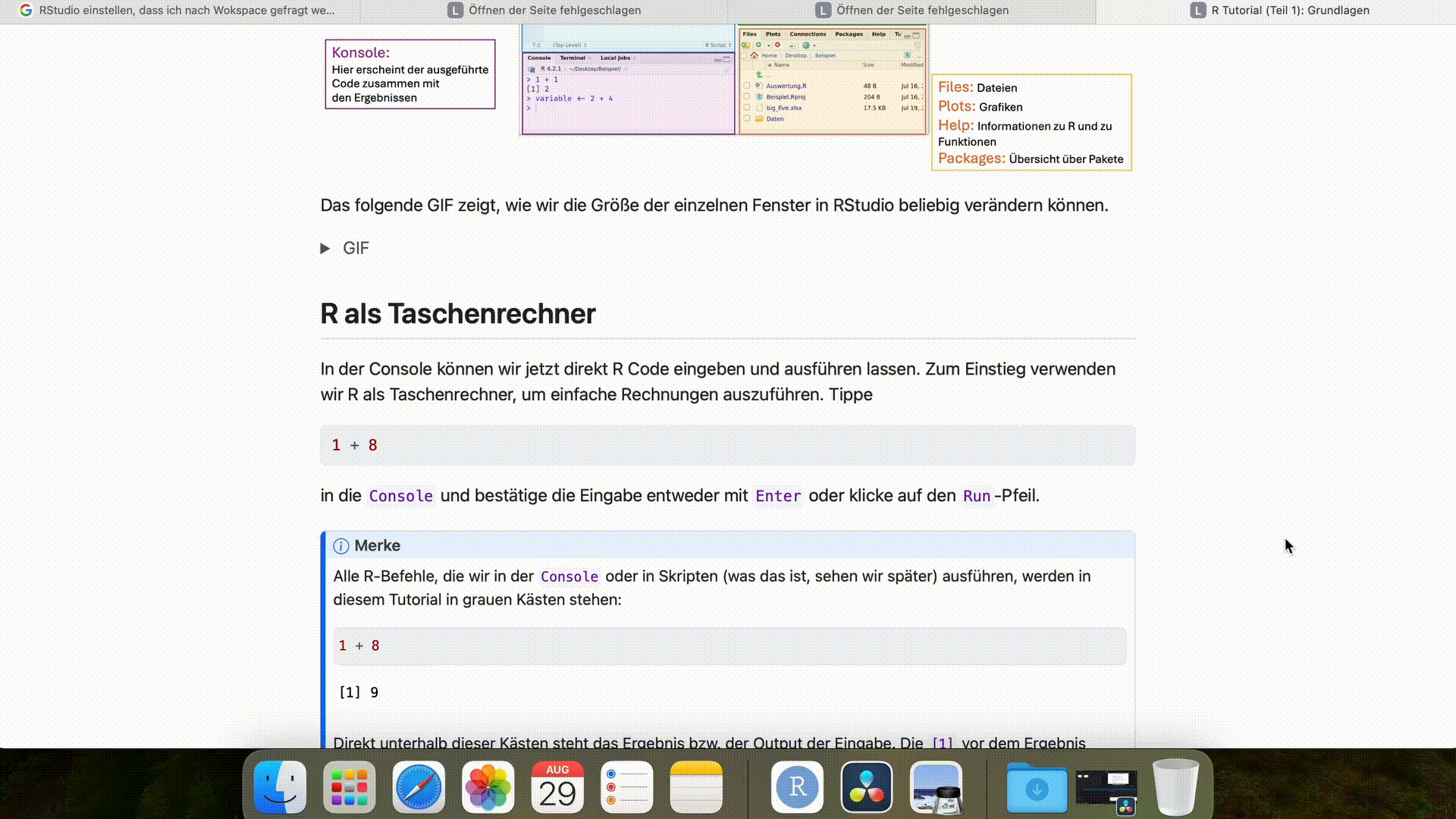 R zu lernen ist genauso wie eine neue Sprache zu lernen. Man muss die Inhalte immer wieder wiederholen, bis das Gelernte in der Praxis selbstständig angewendet werden kann. Seien Sie nicht zu streng zu sich selbst und erwarten Sie nicht, dass Sie nach dem ersten Durchlauf des Tutorials bereits alle Inhalte verinnerlicht haben. Unser Tutorial soll Sie dazu animieren, die gelehrten Inhalte gleich auszuprobieren. Deshalb haben wir den Text und unsere Beispiele immer wieder ergänzt durch Bilder und kleine GIFs (kurze Videos ohne Ton), die die Arbeit mit dem Programm erläutern. Ein ganz wichtiger Teil des Tutorials sind außerdem die Übungen, die in den roten Kästen präsentiert werden. Im ersten dieser Kästen werden wir Sie gleich dazu auffordern, die gezeigten Programme auf Ihrem eigenen Computer zu installieren. Unsere Erfahrung zeigt, dass das Erlernen von R und RStudio nur dann funktioniert, wenn Sie von Anfang an versuchen, selbst damit zu arbeiten und die Inhalte regelmäßig wiederholen.