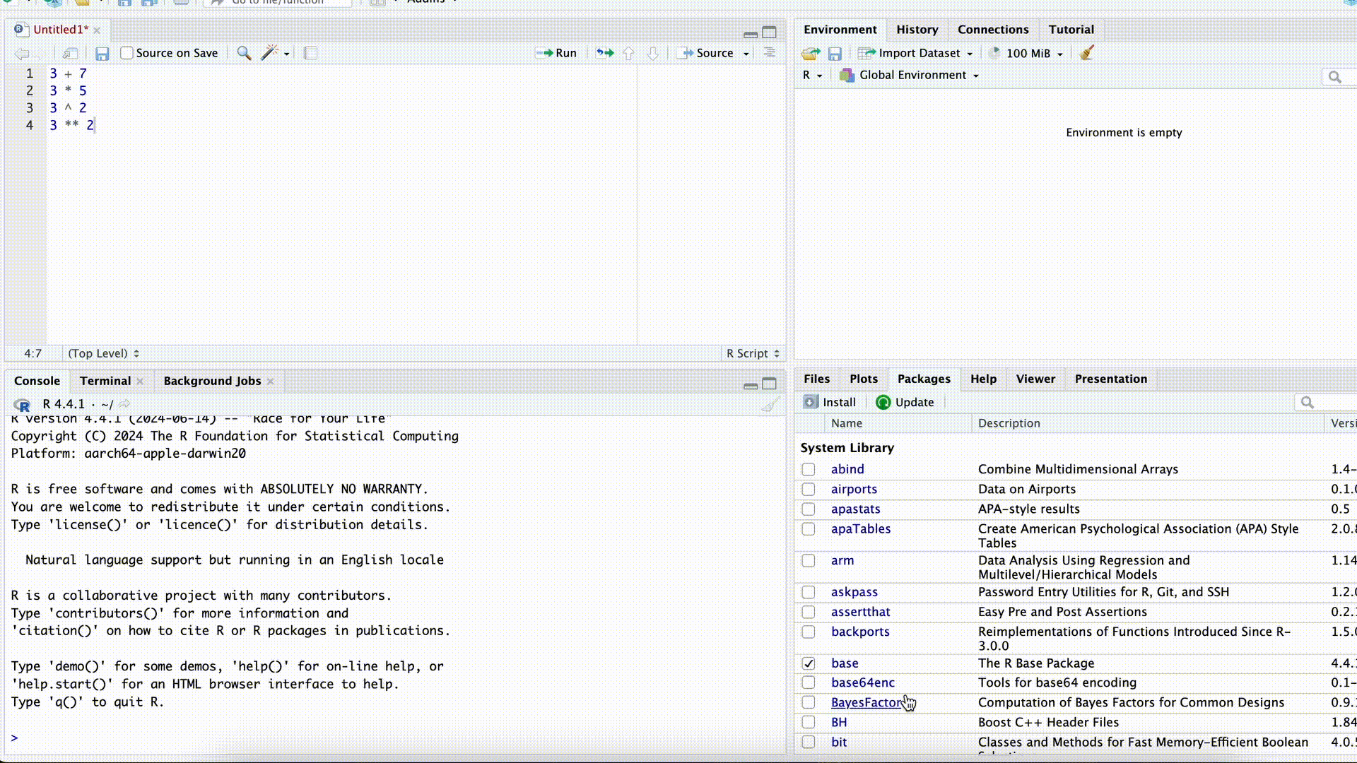 Wenn wir RStudio geöffnet haben, können wir in das Fenster namens Console (unten links) direkt R Befehle/Code eingeben und ausführen lassen. Zum Einstieg verwenden wir R wie einen Taschenrechner, um einfache Rechnungen auszuführen. Tippen Sie…