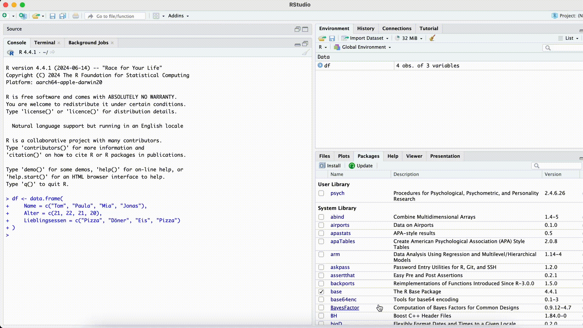Wir sehen im Output von str(), dass unser data.frame 4 Zeilen (obs. steht für observations) und 3 Spalten (variables). Die erste Spalte heißt Name und besteht aus character-Werten (chr). Die zweite Spalte heißt Alter und besteht aus Zahlen (num für numeric). Die dritte Spalte heißt Lieblingsessen und besteht wieder aus character-Werten.