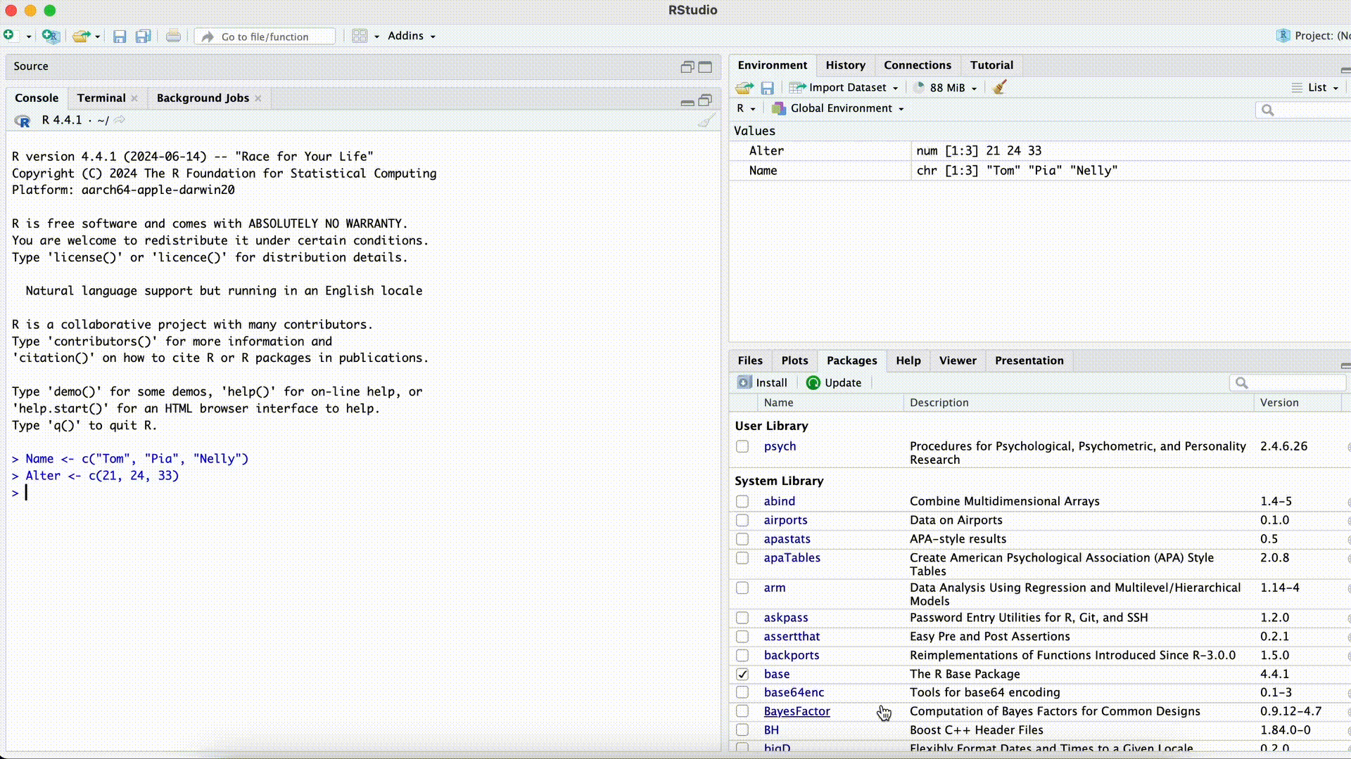 Name <- c("Tom", "Pia"> Name <- c("Tom", "Pia" +Auch bei diesem Fehler zeigt die Console solange