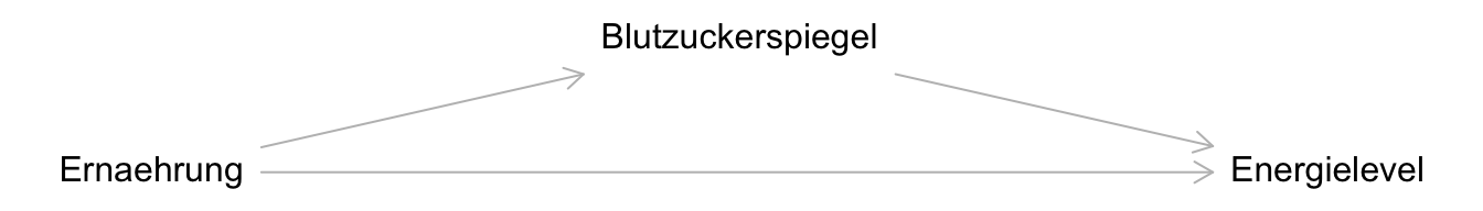 Sie interessieren sich für den direkten kausalen Effekt von Ernährung auf das Energielevel einer Person. Sie gehen in Ihrem Modell davon aus, dass gesunde Ernährung das Energielevel hebt. Gleichzeitig senkt gesunde Ernährung den Blutzuckerspiegel, was wiederum zu einem höheren Energielevel führt.