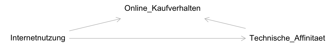 Sie interessieren sich für den direkten kausalen Einfluss der regelmäßigen Internetnutzung einer Person auf deren technische Affinität. Sie gehen davon aus, dass das Online-Kaufverhalten der Person sowohl von der Internetnutzung, als auch von der technischen Affinität der Person kausal beeinflusst wird.
