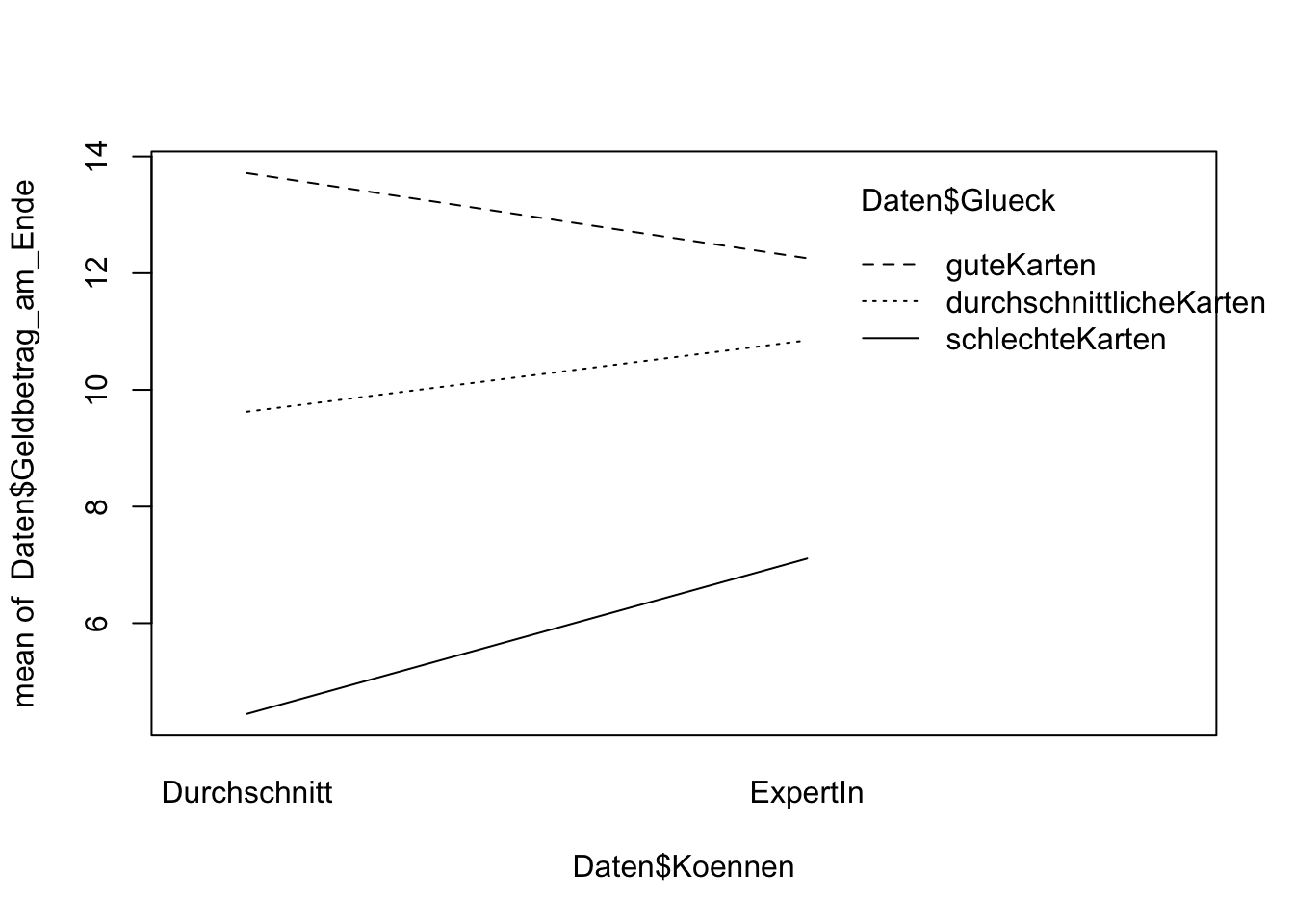 interaction.plot(Daten$Glueck, Daten$Koennen, Daten$Geldbetrag_am_Ende)