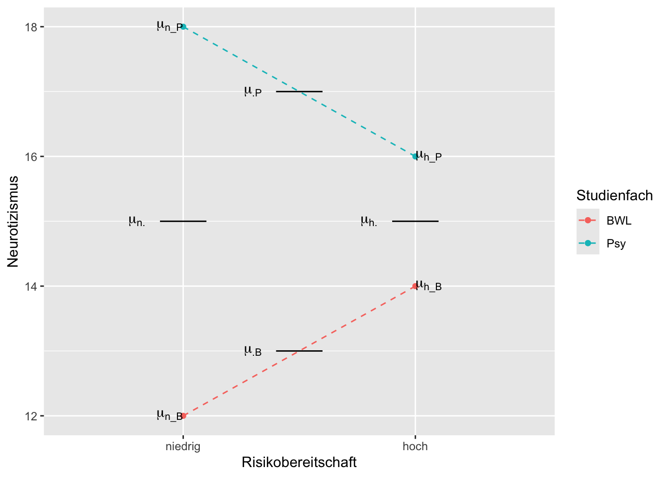 Bei dem eingezeichneten Profilplot liegt eine Interaktion von Risikobereitschaft und Studienfach vor, da \(\mu_{n\_ P} - \mu_{h\_ P} \neq \mu_{n\_ B} - \mu_{h\_ B}\) bzw. \(\mu_{n\_ P} - \mu_{n\_ B} \neq \mu_{h\_ P} - \mu_{h\_ B}\). Es liegt ein Haupteffekt Studienfach vor, da \(\mu_{\cdot P} \neq \mu_{\cdot B}\) (damit kann nicht gelten: \(\beta_{P} = \mu_{\cdot P} - \mu = 0 = \mu_{\cdot B} - \mu = \beta_{B}\)). Es liegt kein Haupteffekt Risikobereitschaft vor, da \(\mu_{n \cdot} = \mu_{h \cdot}\) (damit gilt auch: \(\alpha_{n} = \mu_{n \cdot} - \mu = 0 = \alpha_{h} = \mu_{h \cdot} - \mu)\).